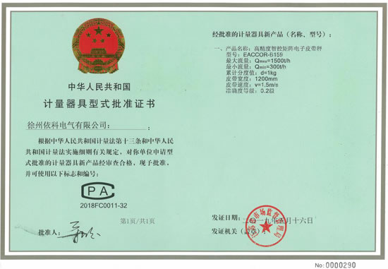 熱烈祝賀徐州依科電氣有限公司專利技術(shù)高精度智控矩陣電子皮帶秤EACCOR-B159獲得0國家0.2級計量證書CPA2018FC0011-32批準(zhǔn)證書,配套高精度矩陣傳感器及矩陣智能稱重控制器(采用SEQ-AI智能算法,矩陣控制跟蹤復(fù)核技術(shù),...